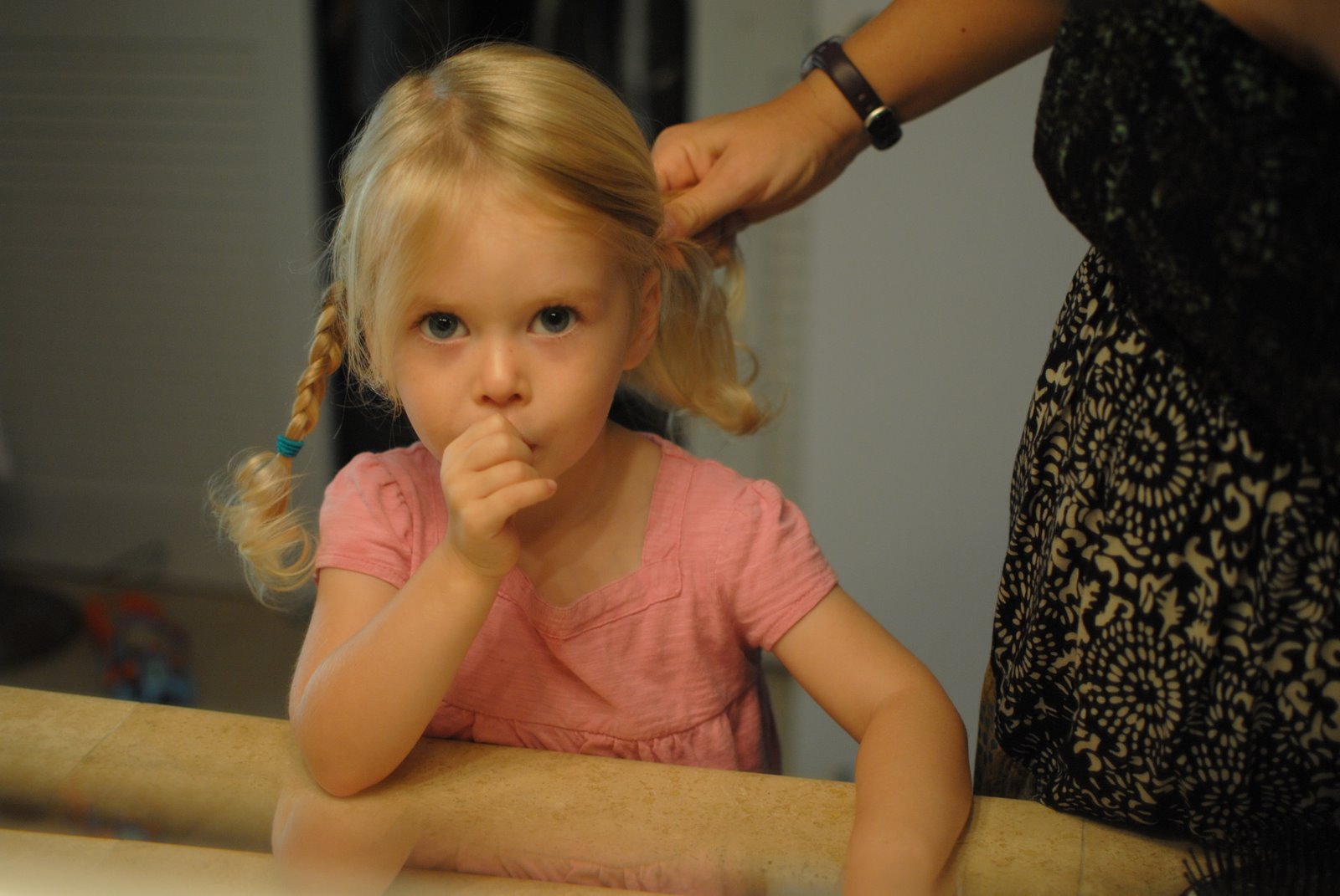 The kids received the first three audiobooks in the "Little House on the Prairie" series for Christmas. (Thanks O &R!) They were such a huge hit, that we continued through the remaining 6 books in the series, thanks to our awesome school library. We listened only when in the car, driving to and from school, which when you think about it is alot of car time. But it took us 4 months of listening nearly every school day. There were many discussions and take-a-ways from the stories, each kiddo at a different stage of understanding (and at times willingness to listen). One sweet take-away for the girls has been the braids. Laura and Mary always wore their hair in braids tied with bows at the ends. And so, for nearly 2 months now the girls been requesting braids in their hair (minus the bows) nearly every day.
